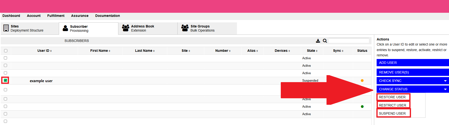 - Choose RESTORE USER to move the subscriber back to Active status.